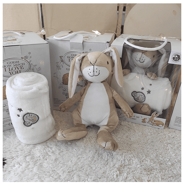 Conoce el suave peluche de conejo del libro clásico Guess How Much I Love You. Es ideal para regalar a futuras mamás y recién nacidos. Incluye un conejo de peluche de 35 x 23 cm y una manta muy suave de 90 x 75 cm en una caja de regalo.